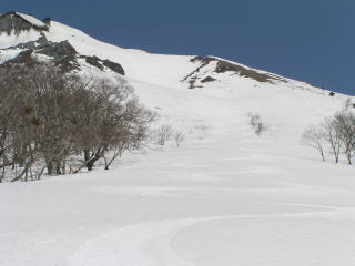 正面左の稜線より滑走する。稜線直下の斜度はきつい。